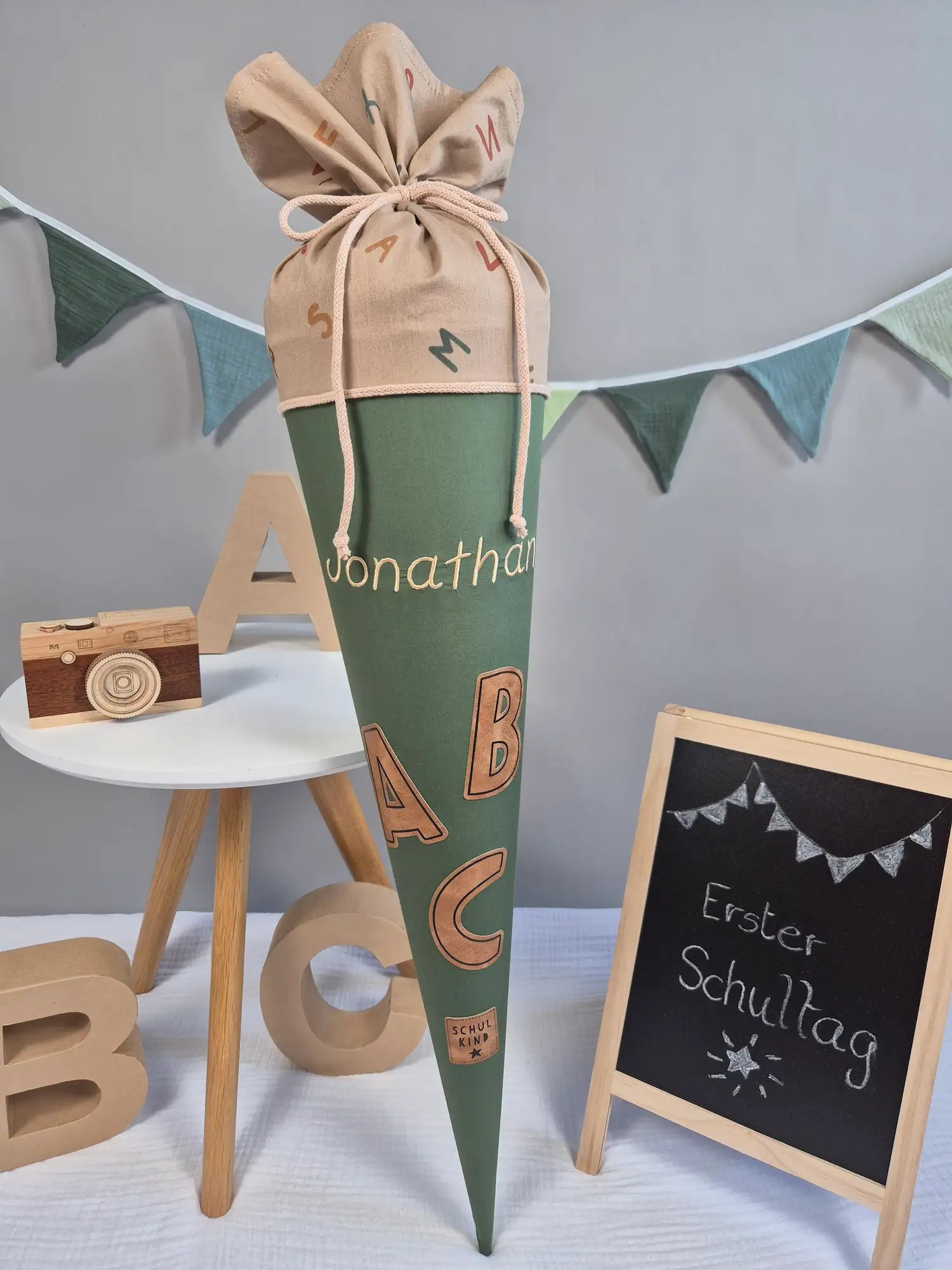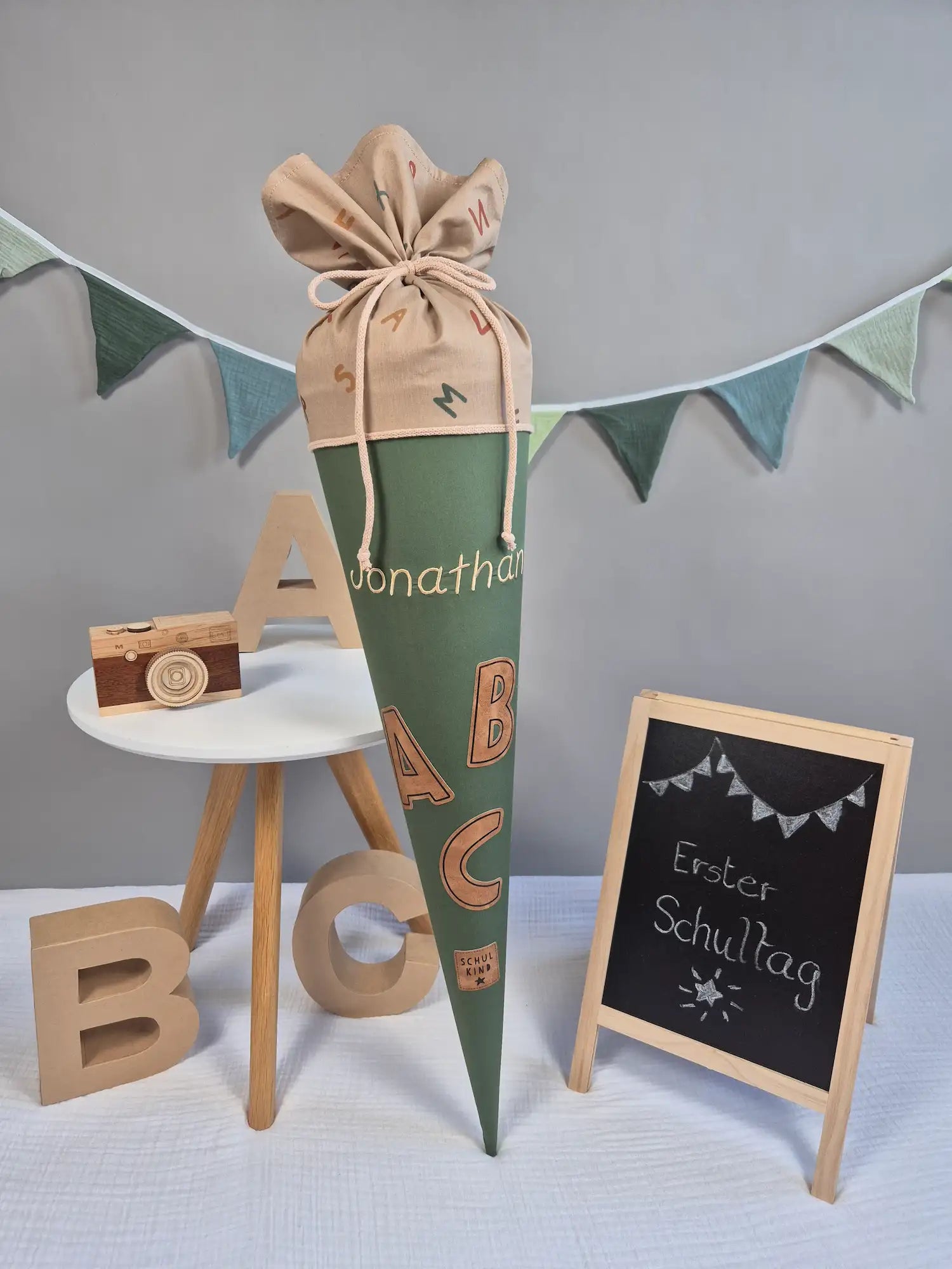 Eine zauberhafte Schultüte, die als Hauptstoff eine Baumwolle in der Farbe grün hat und als Stoff oben eine Baumwolle in braun/beige mit bunten Buchstaben. Das Motiv sind drei Buchstaben aus Leder (A,B,C) sowie ein Lederschild mit der Aufschrift "Schulkind". Den Übergang zwischen Hauptstoff und Oberstoff der Schultüte bildet eine Kordel.