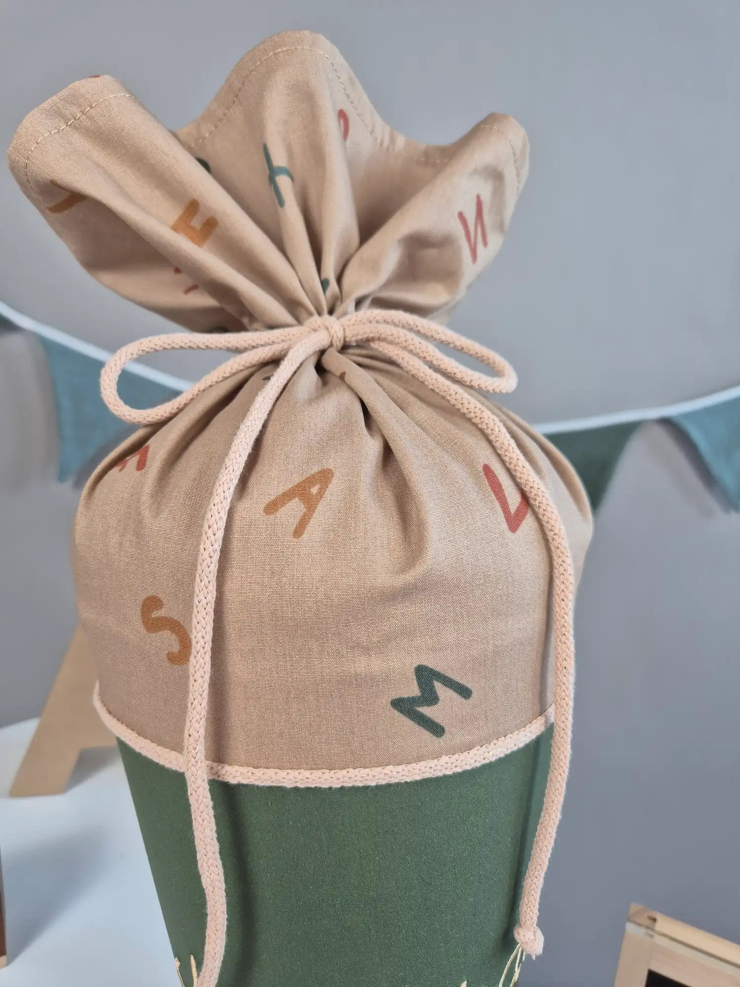 Auf die Schultüte kann der Name des Kindes gestickt werden (oberhalb des Motivs). Bitte gib bei Personalisierung deinen Wunsch für den Namen an. Die Stickfarbe und die Schriftarten sind oben beispielhaft in den Bildern zu sehen.