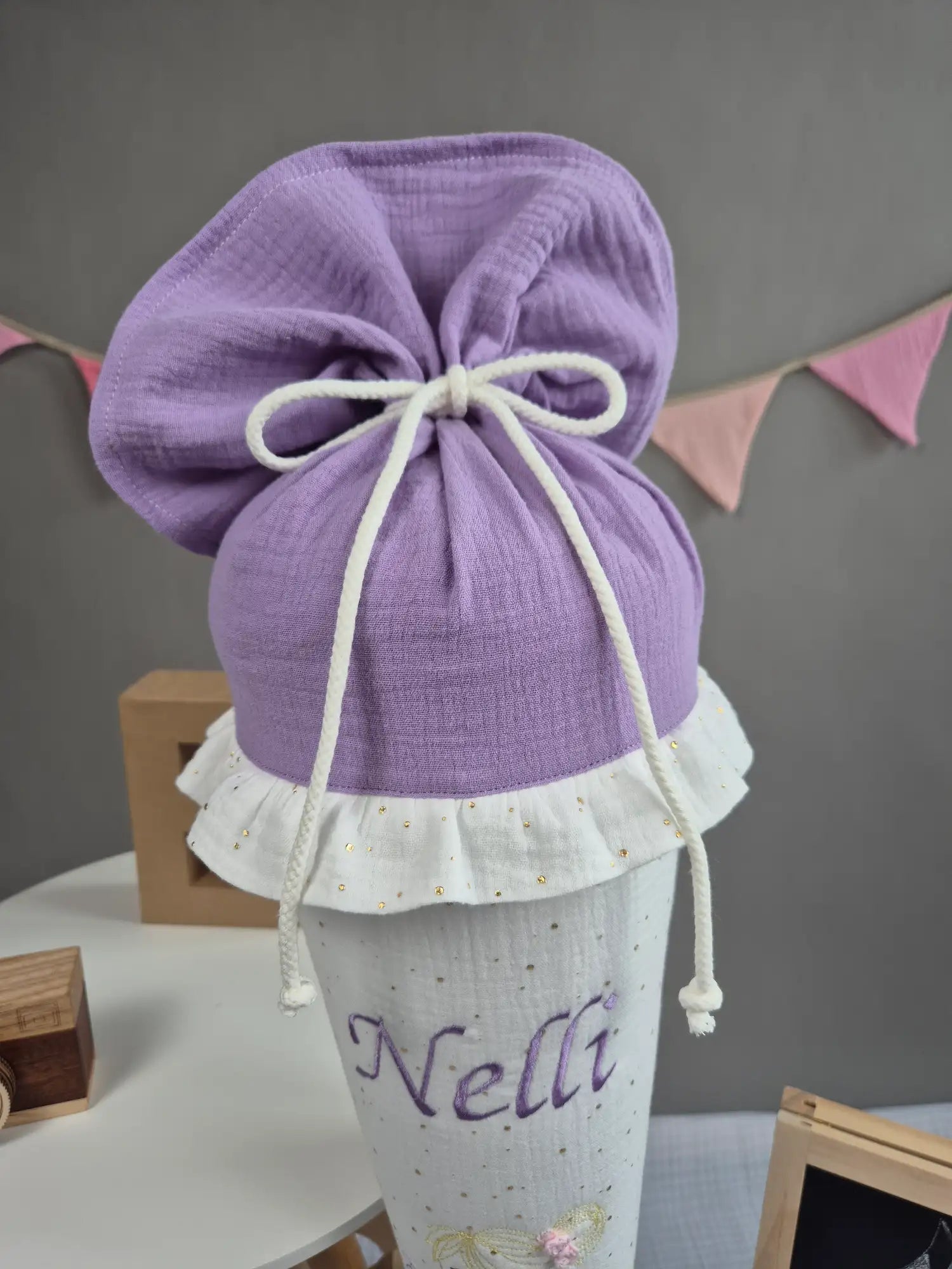 Der Musselinstoff oben an der Schultüte kann aus den angegebenen Optionen ausgewählt werden. Zum Zubinden ist eine farblich passende Kordel, wie abgebildet, enthalten.
