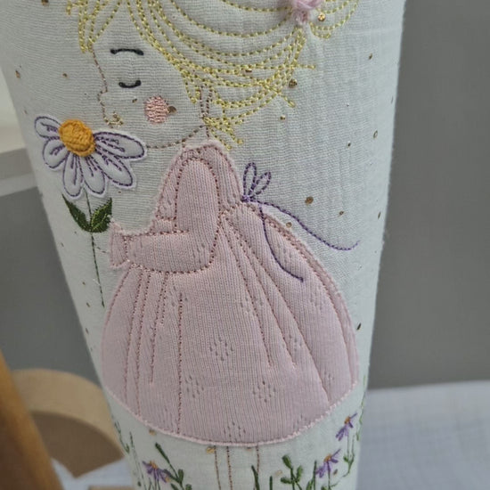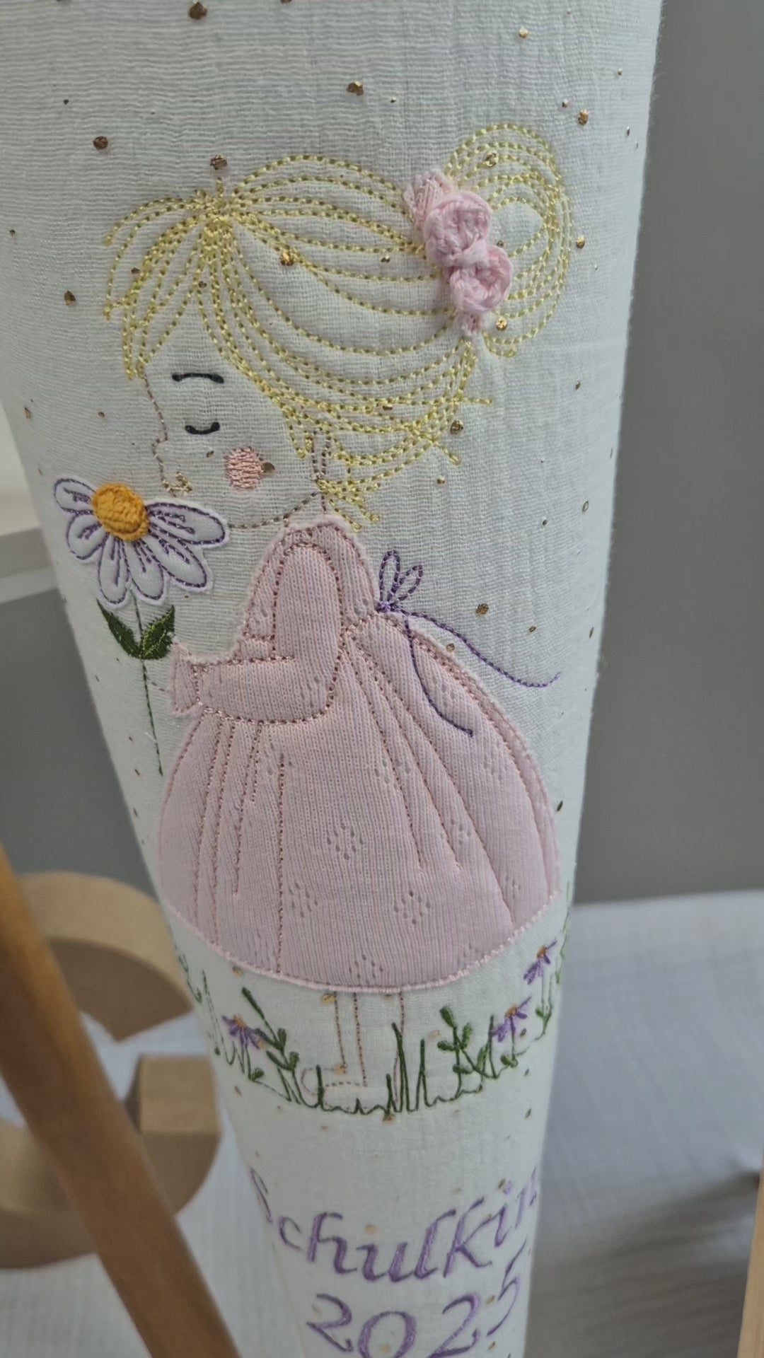 Eine zauberhafte Schultüte aus Musselin in der Hauptfarbe weiß mit goldenen Glitzerpunkten und als Stoff oben flieder (14). Sie besticht durch ihre niedlichen Details. Die Blume und das Kleid sind mit Stoff unterlegt und im Haar trägt das Mädchen eine niedliche kleine Häkelschleife. Der Musselinstoff wurde mit Volumenvlies unterlegt, sodass die Schultüte schön stabil ist und auch später mit einem Schultütenkissen (kann zusätzlich erworben werden) sehr schick aussieht.