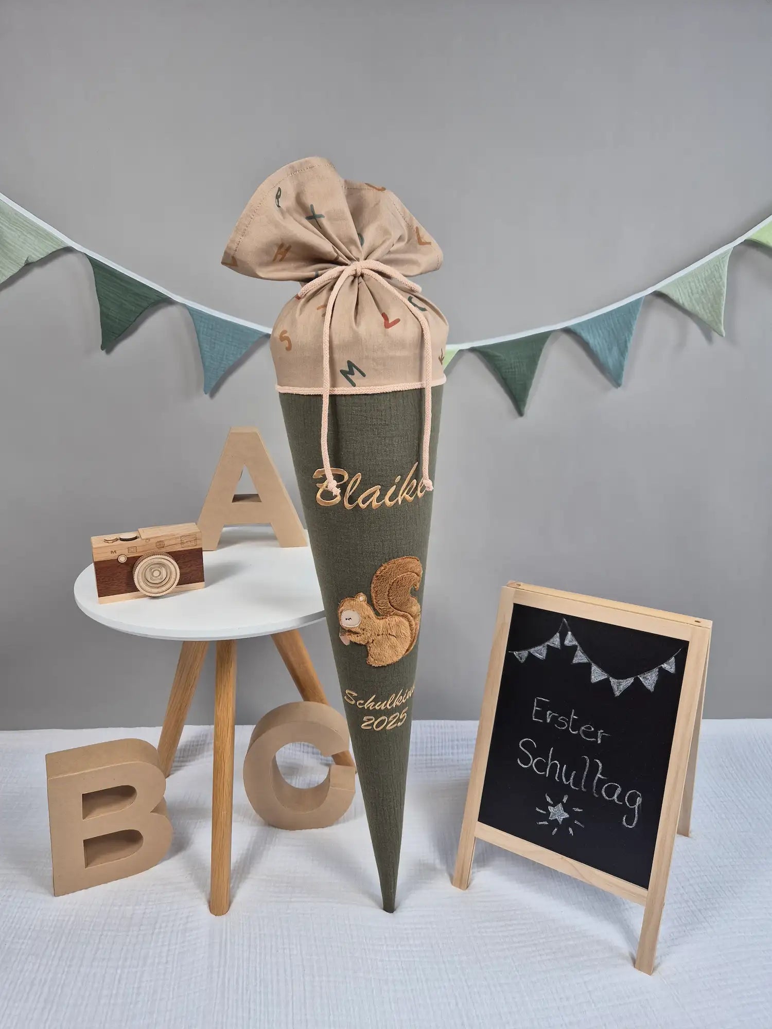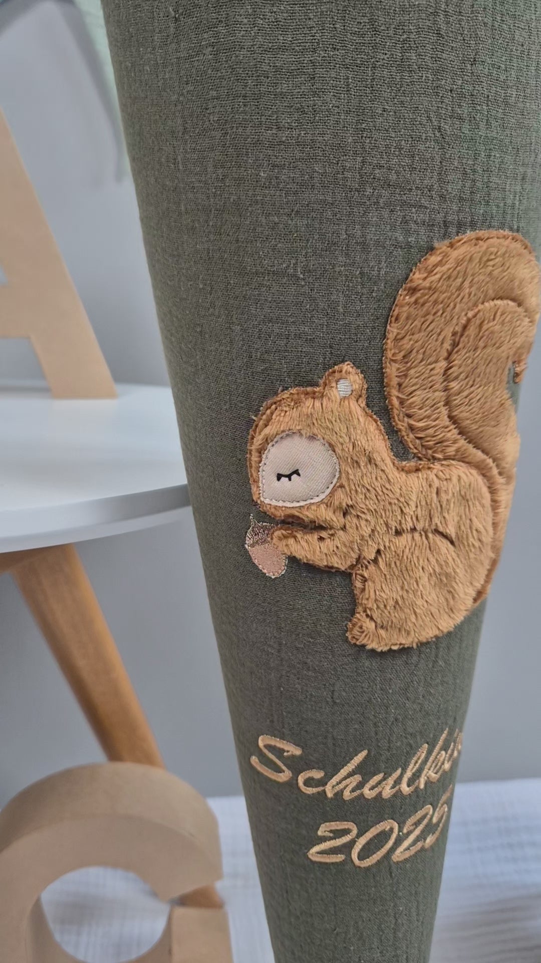 Eine niedliche Schultüte aus Musselin in der Hauptfarbe olive und als Stoff eine Baumwolle in beige mit bunten Buchstaben. Das Motiv ist ein Eichhörnchen, das mit kuschligem Fell gestickt ist. Ein tolles Motiv für alle kleinen Tierfreunde. Den Übergang zwischen Hauptstoff und Oberstoff der Schultüte bildet eine aufgenähte Kordel. Der Musselinstoff wurde mit Volumenvlies unterlegt, sodass die Schultüte schön stabil ist und auch später mit einem Schultütenkissen (kann zusätzlich erworben werden) sehr schick aussieht.