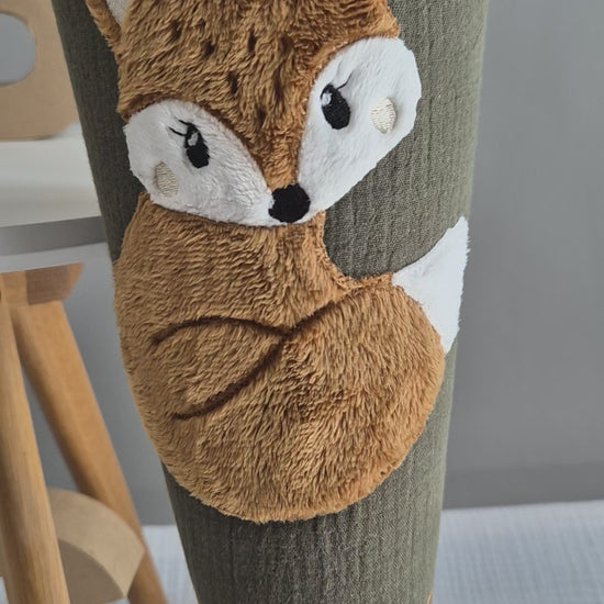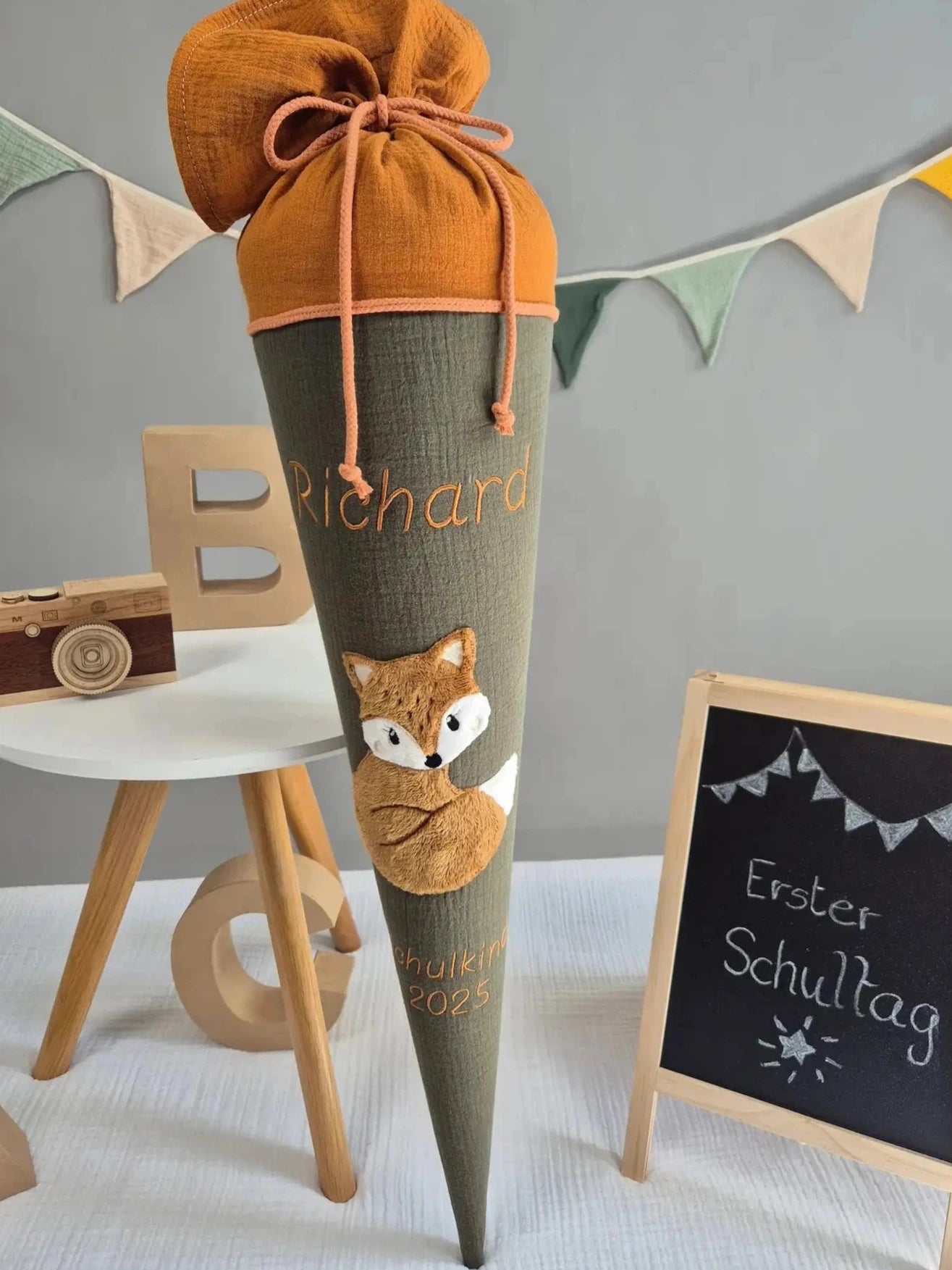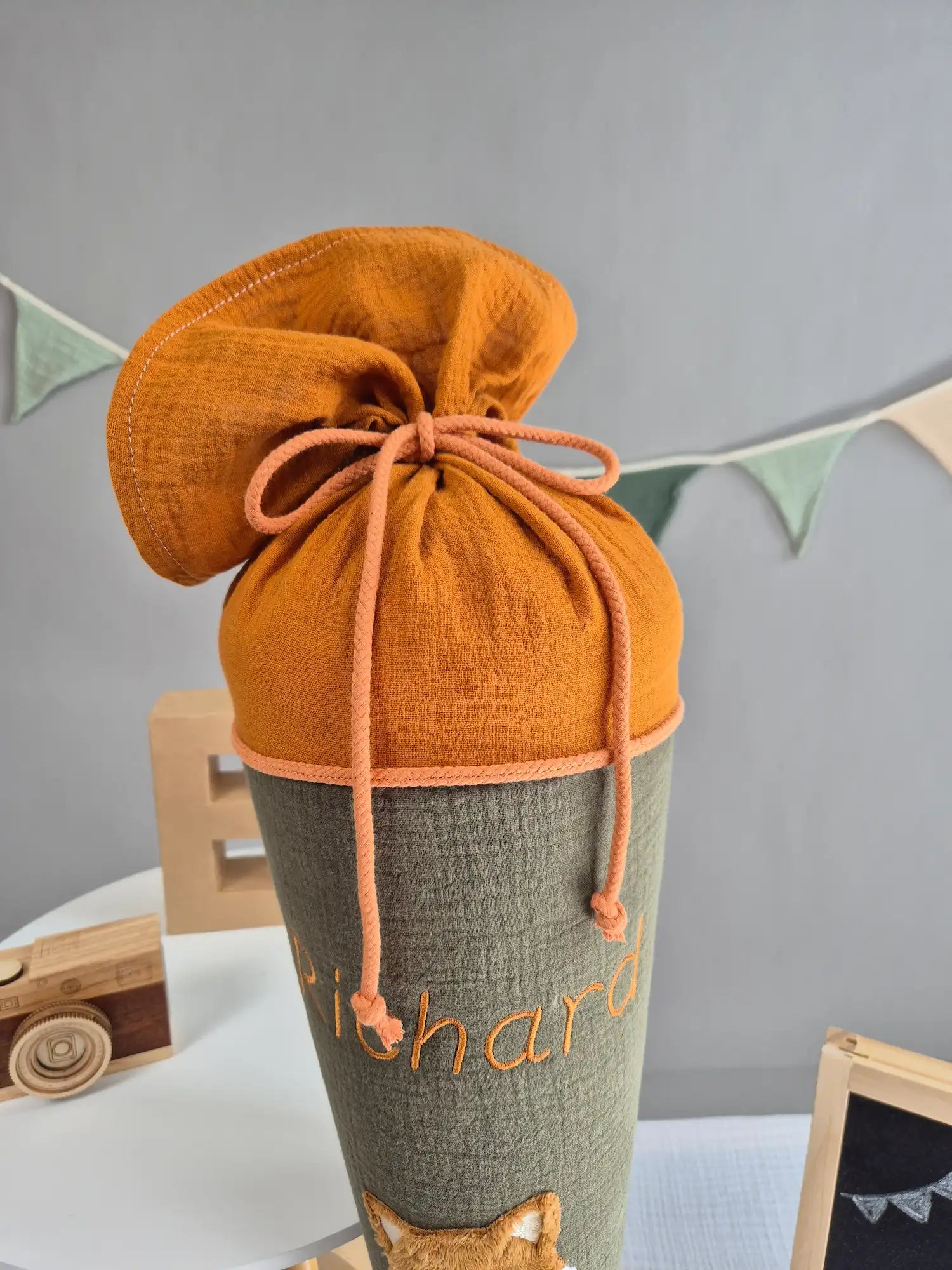 Eine niedliche Schultüte aus Musselin in der Hauptfarbe olive und als Stoff oben zimt. Das Motiv ist ein Fuchs, der mit kuschligem Fell gestickt ist. Ein tolles Motiv, das ausdrucksstark, aber zugleich auch dezent wirkt. Den Übergang zwischen Hauptstoff und Oberstoff der Schultüte bildet eine aufgenähte Kordel. Der Musselinstoff wurde mit Volumenvlies unterlegt, sodass die Schultüte schön stabil ist und auch später mit einem Schultütenkissen (kann zusätzlich erworben werden) sehr schick aussieht.