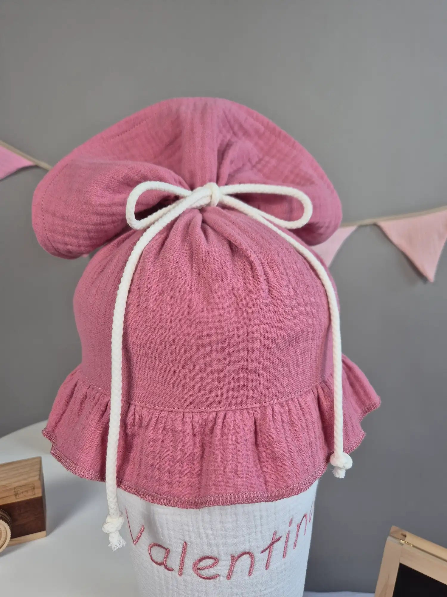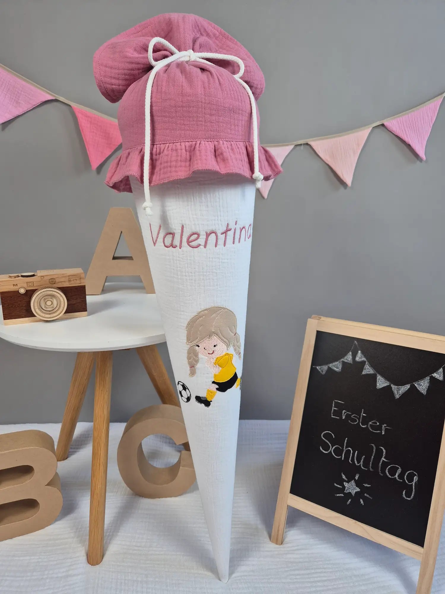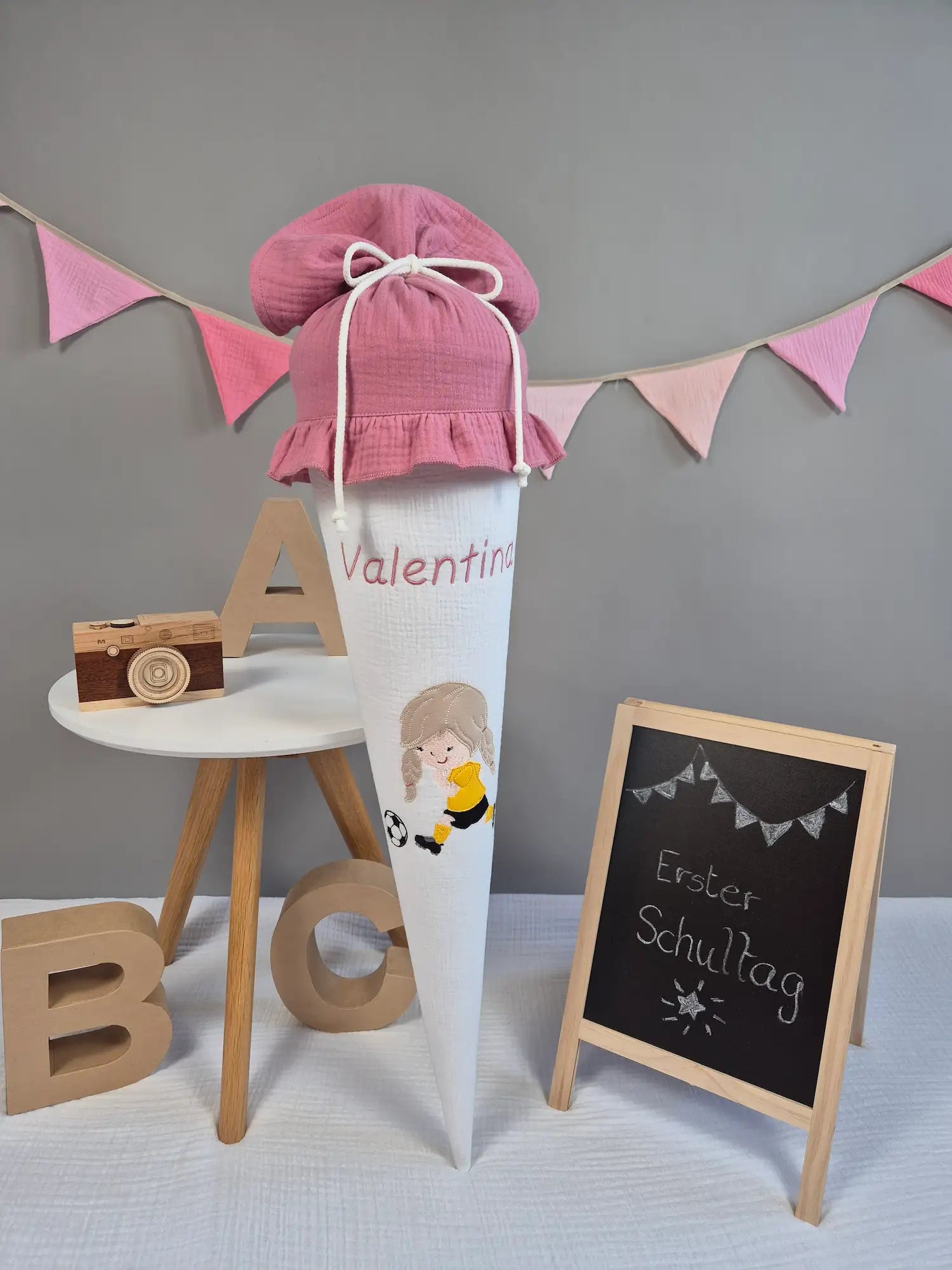 Eine zauberhafte Schultüte aus Musselin in der Hauptfarbe weiß und als Stoff oben rosa. Den Übergang zwischen Hauptstoff und Oberstoff bildet eine Rüsche in rosa. Die Schultüte besticht durch ihre niedlichen Details. Der Musselinstoff wurde mit Volumenvlies unterlegt, sodass die Schultüte schön stabil ist und auch später mit einem Schultütenkissen (kann zusätzlich erworben werden) sehr schick aussieht.