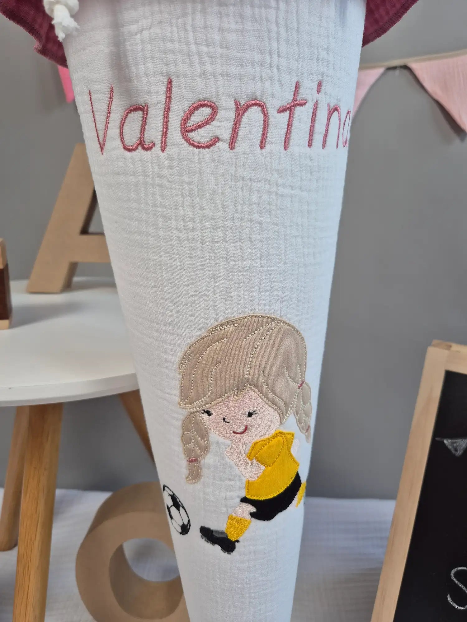 Auf die Schultüte kann der Name des Kindes gestickt werden (oberhalb des Motivs) und der Schriftzug "Schulkind 2026" (unterhalb des Motivs). Bitte gib bei Personalisierung deinen Wunsch für den Namen an und, ob du den Schriftzug "Schulkind 2026" gestickt haben möchtest. Die Stickfarbe ist wie abgebildet. Die Schriftarten sind oben beispielhaft in den Bildern zu sehen.